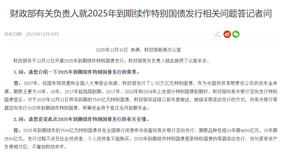 财联社12月10日电,财政部拟发行2025年到期续作特别国债(一期)、(二期),第一期为10年期固定利率附息债,第二期为15年期固定利率附息债。发行日期为2025年12月12日。第一期发行面值4000亿元,第二期发行面值3500亿元。两期国债票面利率均为发行日前一至五个工作日(含第一和第五个工作日)中国国债收益率曲线中,同期限国债收益率算术平均值(四舍五入计算到0.01%)。两期国债均于2025年12月12日开始计息,每半年支付一次利息,付息日为每年6月12日(节假日顺延,下同)和12月12日;第一期于2035年12月12日偿还本金并支付最后一次利息,第二期于2040年12月12日偿还本金并支付最后一次利息。发行方式为面向境内有关银行定向发行,中国人民银行将面向有关银行开展公开市场操作。