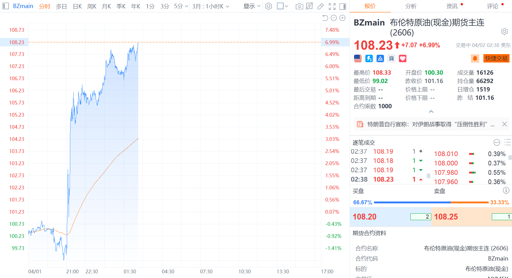 财联社4月2日电,布伦特原油期货涨幅扩大至7%,报108.3美元/桶;WTI原油日内涨幅达6.5%,报106.66美元/桶。