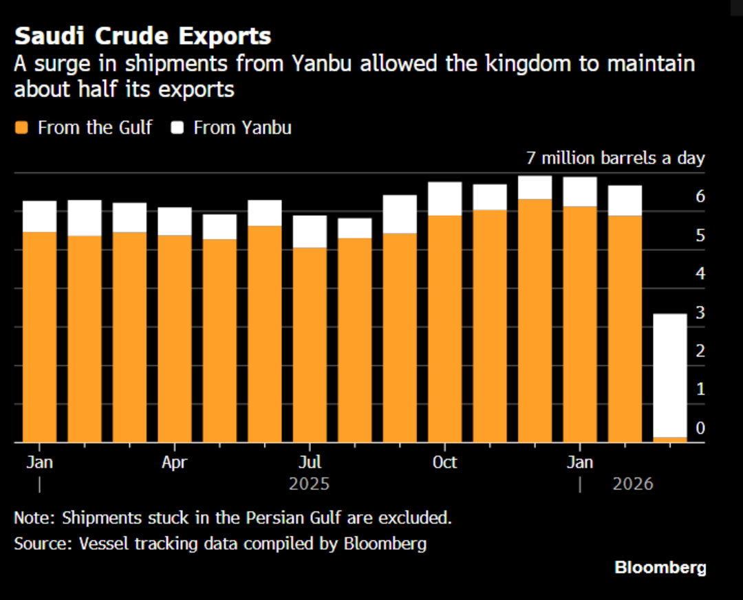 财联社4月1日电,油轮跟踪数据显示,3月出口量平均为每日333万桶。如果沙特未能将原油转运至红海出口终端,降幅本将更大。沙特是全球关键原油供应国,约每六桶通过油轮运输的原油中就有一桶来自该国。自伊朗事实上封锁中东出口国通往公海的通道以来,市场一直关注沙特维持出口的能力。数据显示,2月平均原油出口量为每日666万桶。上述两个月的数据均不包括已装船但仍滞留在波斯湾的货物。