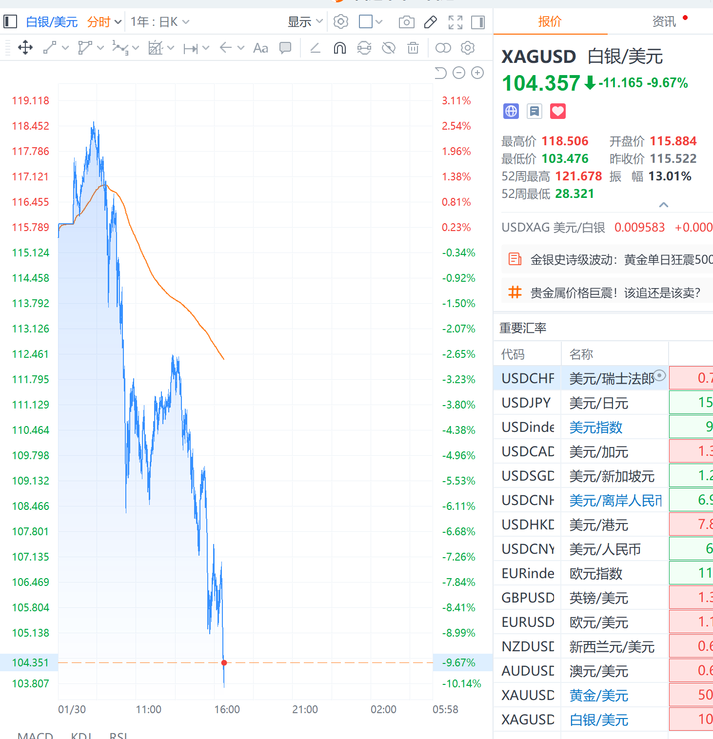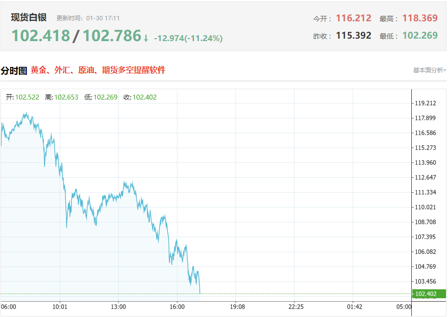 财联社1月31日电,受获利回吐和短期期货交易者多头平仓等因素影响,国际黄金和白银价格1月30日继续大幅下跌,均创下数十年来最大单日跌幅。纽约商品交易所4月黄金期价30日一度跌破每盎司4800美元关口,跌幅超过10%,为上世纪80年代以来最大单日跌幅;3月白银期价一度跌破每盎司80美元关口,跌幅超过30%,创下史上最大单日跌幅纪录。分析人士认为,经历近一个月来金银价格暴涨,此次市场抛售在所难免。总部位于伦敦的布里坦尼亚全球市场公司资产经纪公司分析师表示,考虑到1月份贵金属上涨的速度和幅度,此次回调并不出乎意料。英国研究机构金属聚焦公司分析师认为,近来贵金属上涨行情呈现非理性,但鉴于投资者面临持续的地缘政治风险和经济不确定性,市场抛售或难以持续。