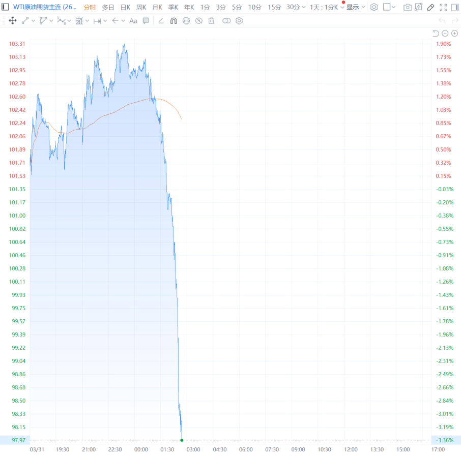 财联社4月1日电,WTI原油期货日内跌超3%,跌破98美元/桶。
