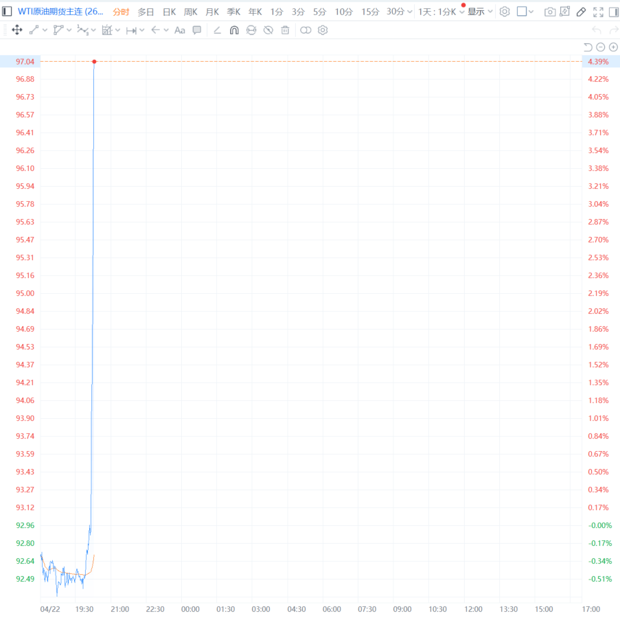 财联社4月22日电,布伦特原油期货向上触及100美元/桶,最新报100.055美元/桶,日内上涨1.6%。