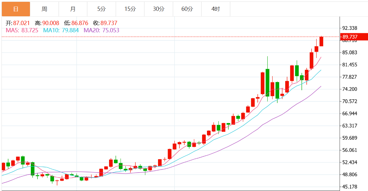 财联社1月13日电,现货白银向上触及89美元/盎司,日内上涨4.65%,创历史新高。现货白银日内连破85、86、87、88、89美元五道关口。