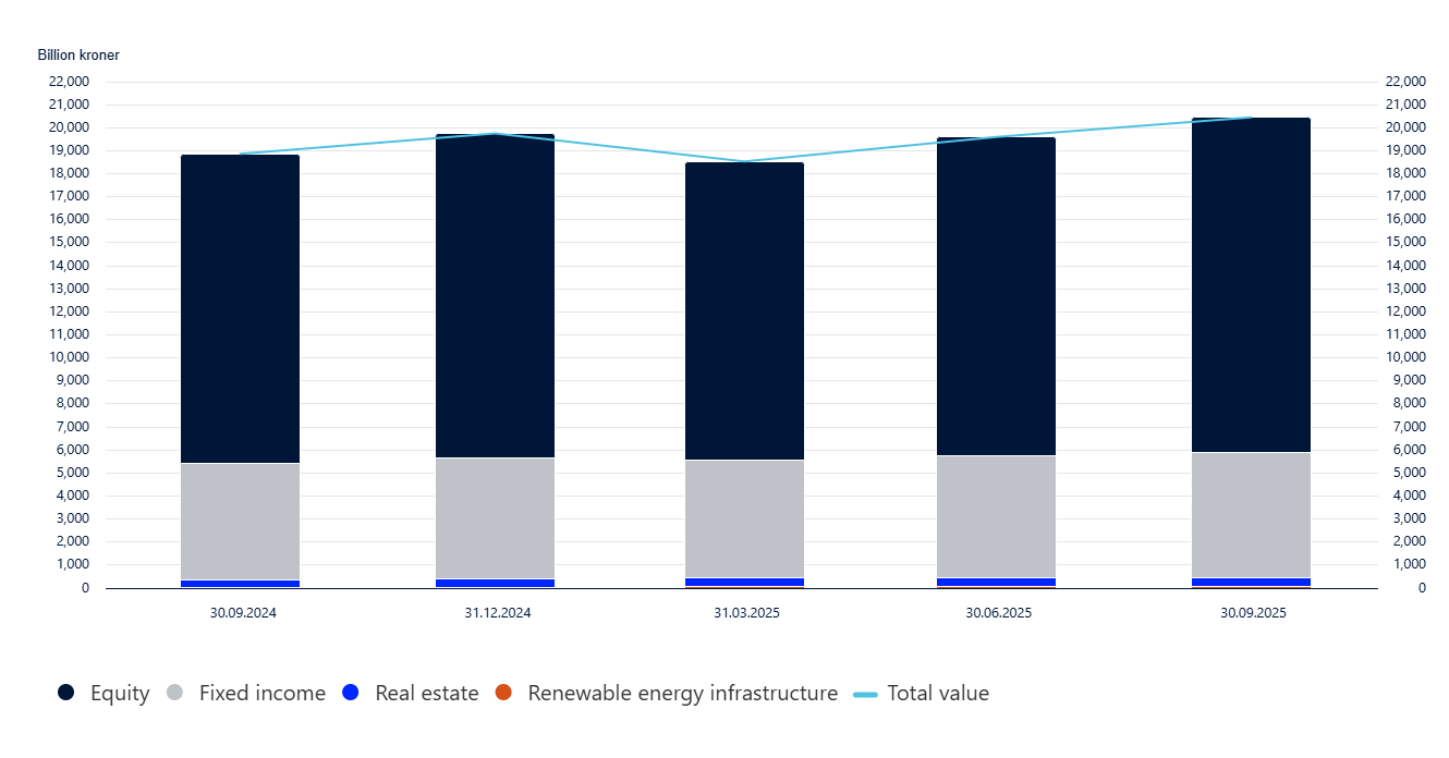 财联社10月29日电,挪威主权财富基金在第三季度实现了5.8%的回报率。该基金的股权投资回报率为7.7%,固定收益投资回报率为1.4%,非上市房地产投资回报率为1.1%。非上市可再生能源基础设施的回报率为0.3%。该基金的回报率比基准指数的回报率低0.06个百分点。今年第三季度,该基金的价值增加了8540亿克朗。会计回报为10,320亿克朗。本季度,克朗兑几种主要货币升值,导致该基金价值下跌2590亿克朗。今年第三季度,扣除管理成本后,流入该基金的资金达810亿克朗。截至2025年9月30日,该基金的价值为204400亿克朗。该基金的71.2%投资于股票,26.6%投资于固定收益,1.8%投资于非上市房地产,0.4%投资于非上市可再生能源基础设施。“这一结果是由股市的强劲回报推动的,特别是在基础材料、电信和金融领域”,挪威银行投资管理公司副首席执行官TrondGrande说。