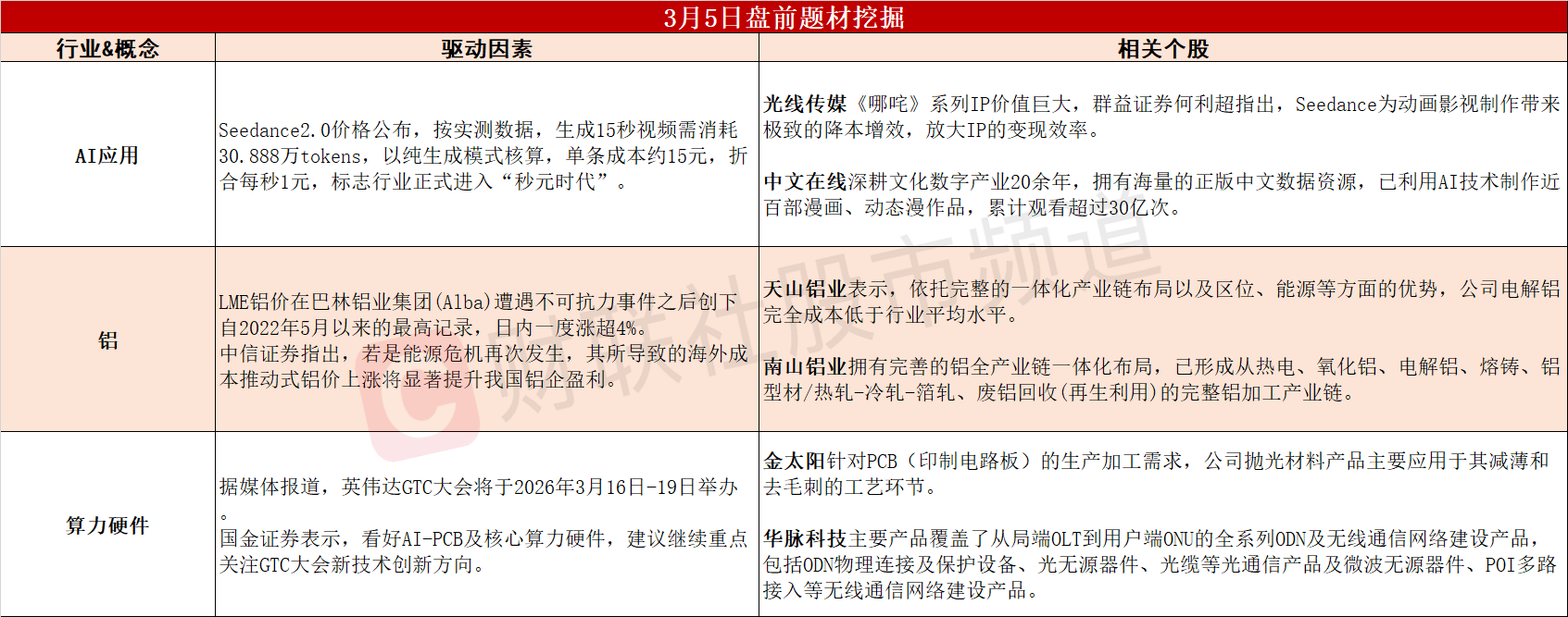 ①每秒1元!Seedance2.0价格公布,AI应用拐点加速到来。②中东局势升温催化铝价大涨,我国铝企盈利有望显著提升。③英伟达GTC大会即将举办,机构持续看好核心算力硬件表现。