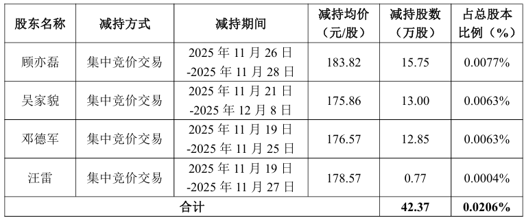 财联社12月24日电,阳光电源(300274.SZ)公告称,公司收到副董事长、高级副总裁顾亦磊、副总裁邓德军、副总裁汪雷出具的《关于股份减持计划实施完成的告知函》和董事、高级副总裁吴家貌出具的《关于股份减持计划提前终止的告知函》,截至本公告披露之日,顾亦磊、邓德军、汪雷减持计划已实施完成,吴家貌决定提前终止减持计划,未减持股份在剩余减持期间内不再减持。顾亦磊、邓德军、汪雷分别减持15.75万股、12.85万股和0.77万股,吴家貌减持13万股,剩余1200股未减持。此次减持后,上述人员持股均有所减少,但公司控制权未变,对持续经营无影响。