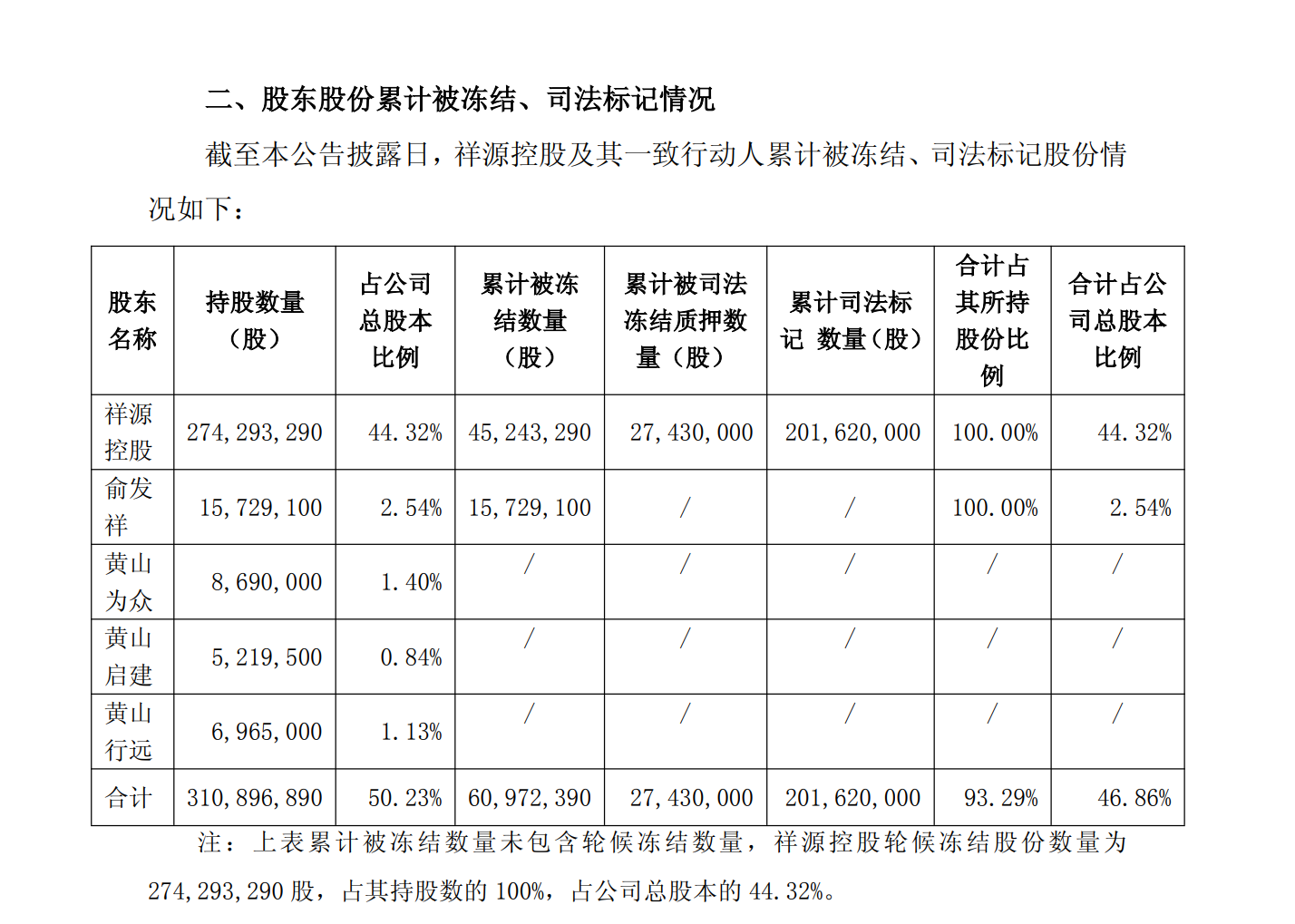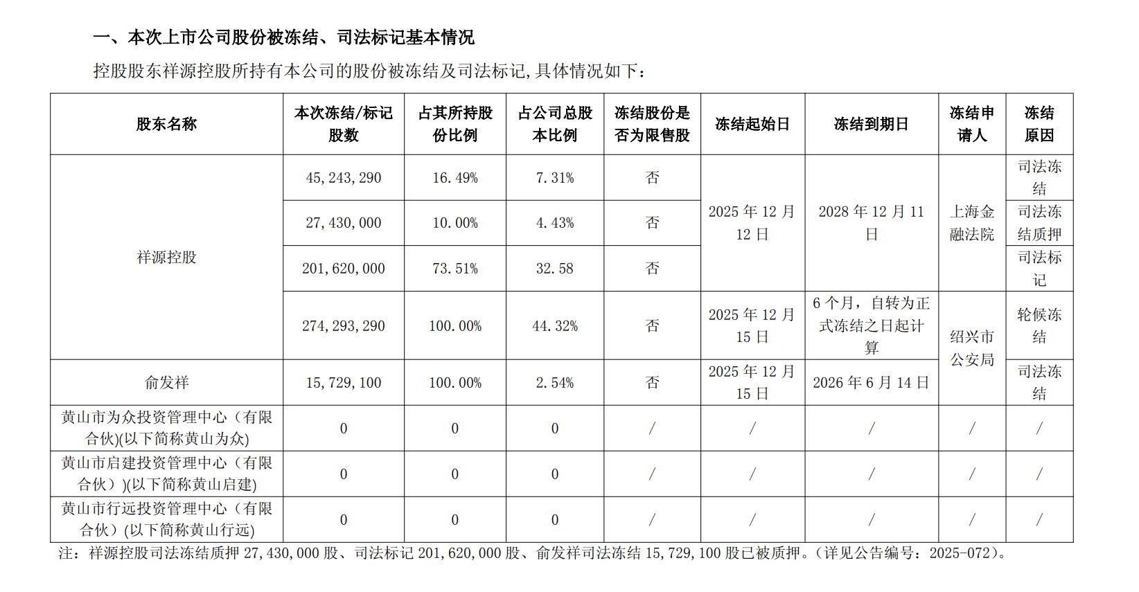 财联社12月16日电,交建股份(603815.SH)公告称,公司控股股东祥源控股关联某平台有关债务风险发生后,各级党委、政府及有关部门高度重视,及时开展调查处置工作。为稳妥有序处置相关风险,维护投资者合法权益,绍兴市帮扶祥源控股工作组于2025年12月12日正式进驻祥源控股,依法依规对祥源控股资产及负债等情况进行排查,督促祥源控股依法履行债务责任,确保祥源控股正常生产经营。公司实际控制人、控股股东目前正在积极妥善解决上述相关事项。公司收到祥源控股及公司实际控制人俞发祥通知,其持有的交建股份2.74亿股流通股被司法冻结、轮候冻结、司法冻结质押、司法标记;实际控制人俞发祥所持公司1572.91万股流通股被司法冻结。本次控股股东股份被冻结暂不会对公司的控制权、股权结构、公司治理等情况产生重大影响,但公司实际控制人、控股股东及其一致行动人股份累计被司法冻结及轮候冻结的比例较高,如上述股份后续涉及司法处置,可能存在影响公司控制权稳定性的风险。
