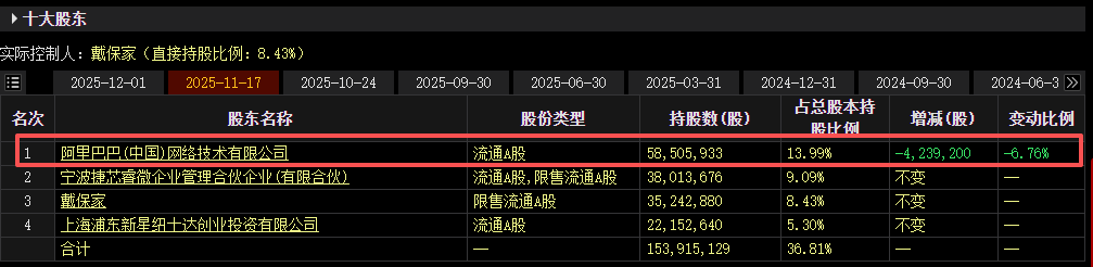 《科创板日报》1日讯,翱捷科技(688220.SH)公告称,阿里巴巴(中国)网络技术有限公司于2025年11月24日至12月1日通过集中竞价及大宗交易方式减持公司股份543.9万股,占公司总股本的比例由13.99%减少至12.69%,权益变动触及1%刻度。本次权益变动属于股东主动减持,不触及要约收购,不会导致公司实际控制人发生变化,不会对公司治理结构及持续经营产生重大影响。
