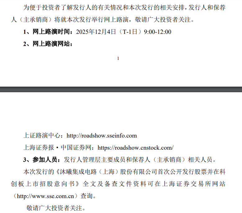 财联社12月2日电,沐曦股份发布首次公开发行股票并在科创板上市网上路演公告,为便于投资者了解发行人的有关情况和本次发行的相关安排,发行人和保荐人(主承销商)将就本次发行举行网上路演。网上路演时间为2025年12月4日(T-1日)9:00-12:00;网上路演网站为上证路演中心、上海证券报·中国证券网。