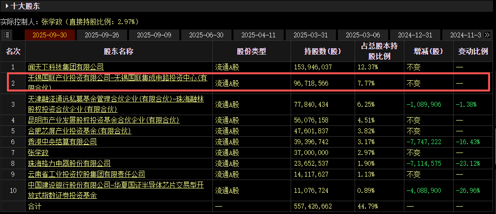 小财注:截至三季度末,无锡国联集成电路投资中心持有闻泰科技7.77%股份,为公司的第二大股东。闻泰科技6月5日公告,股东无锡国联集成电路投资中心计划减持不超3%公司股份。闻泰科技9月26日公告,该股东于2025年6月27日至2025年9月26日减持0.9979%股份,减持计划时间区间已届满。