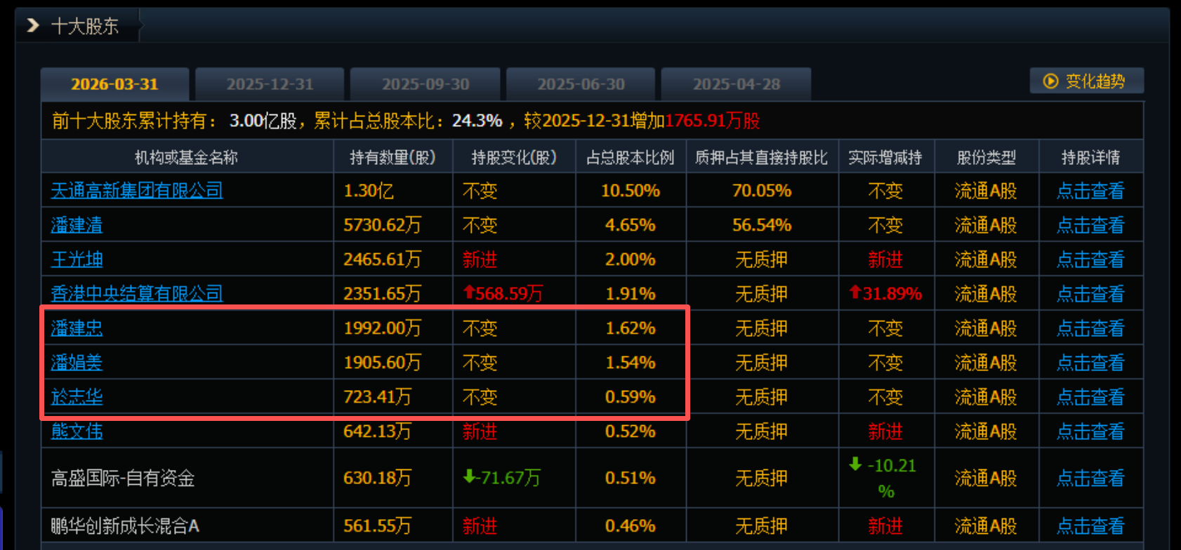 财联社4月30日电,片仔癀(600436.SH)公告称,公司控股股东九龙江集团自2026年2月1日至4月30日,通过集中竞价交易方式累计增持公司股份317.13万股,占总股本0.53%,累计增持金额约5亿元,达到增持计划下限要求。本次增持计划已实施完毕,完成后九龙江集团合计持股3.11亿股,持股比例51.50%。