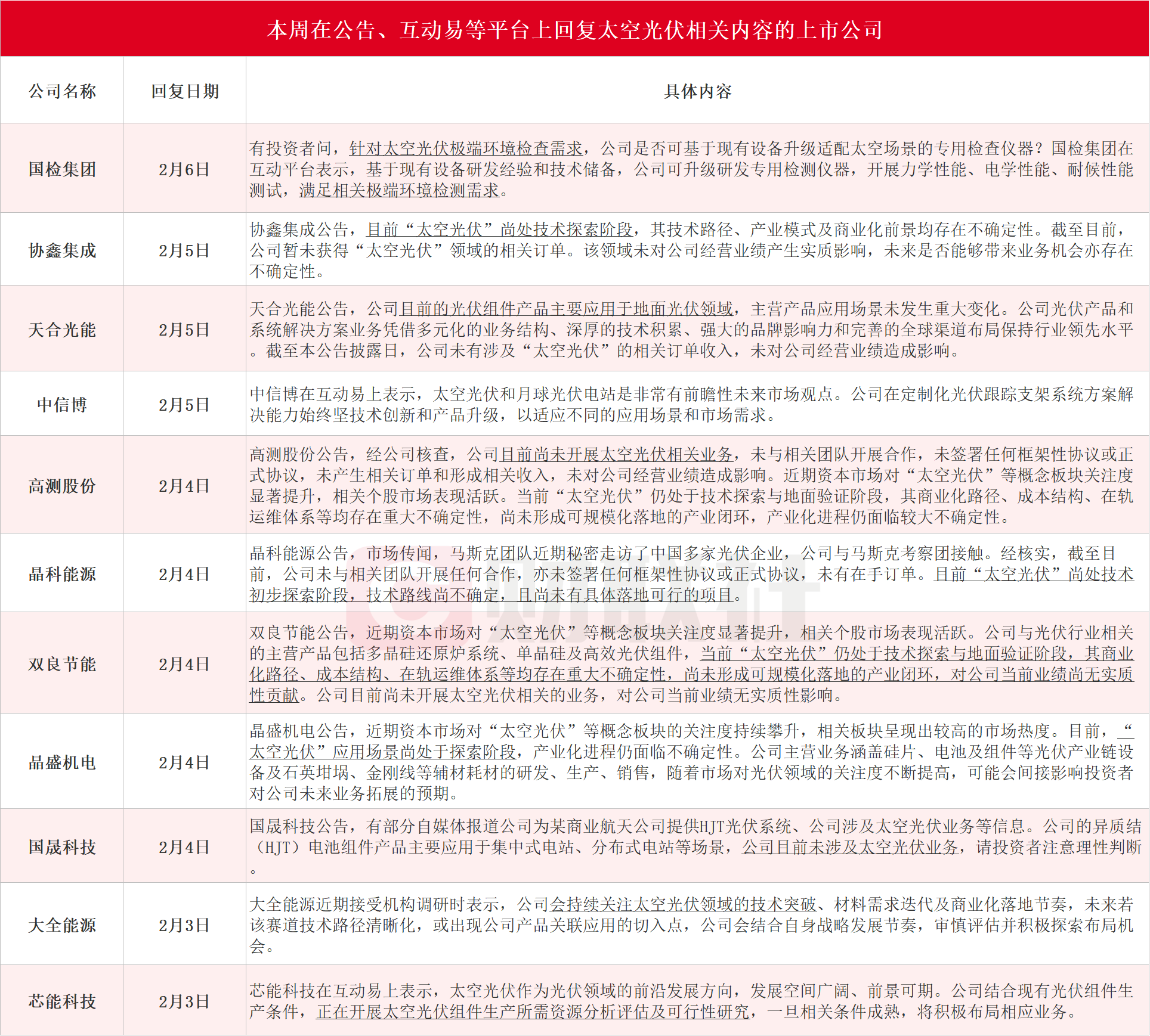 财联社2月8日电,财联社记者从多位产业链人士处获悉,马斯克团队近期“摸底”中国光伏产业链。A股方面,探索适用于外太空及空间站场景的光伏设备研发的协鑫集成周五收盘斩获三连板。据财联社不完全统计,本周包括国检集团、协鑫集成、天合光能、中信博、高测股份、晶科能源、双良节能、晶盛机电、国晟科技、大全能源、芯能科技在内的11家上市公司在公告、互动易等平台上回复太空光伏相关内容。协鑫集成2月5日公告,截至目前,公司暂未获得“太空光伏”领域的相关订单。该领域未对公司经营业绩产生实质影响,未来是否能够带来业务机会亦存在不确定性。