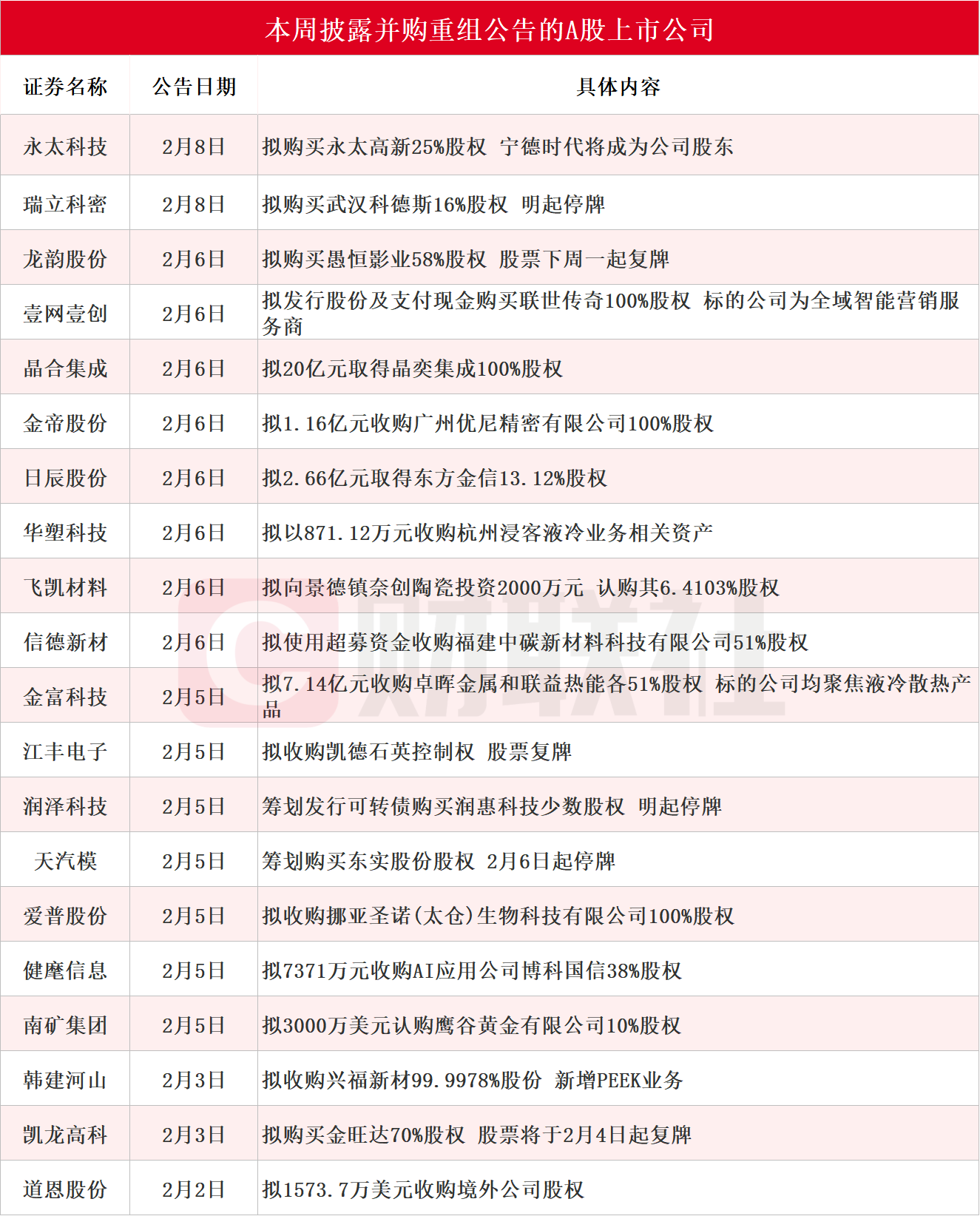 财联社2月8日电,据财联社不完全统计,截至发稿,本周(2月2日-2月8日)包括永太科技、瑞立科密、龙韵股份、壹网壹创、晶合集成、金帝股份、日辰股份、华塑科技、飞凯材料、信德新材、金富科技、江丰电子、润泽科技、天汽模、爱普股份、健麾信息、南矿集团、韩建河山、凯龙高科和道恩股份在内的20家A股上市公司披露并购重组进展最新公告。其中,永太科技拟购买永太高新25%股权,宁德时代将成为公司股东。