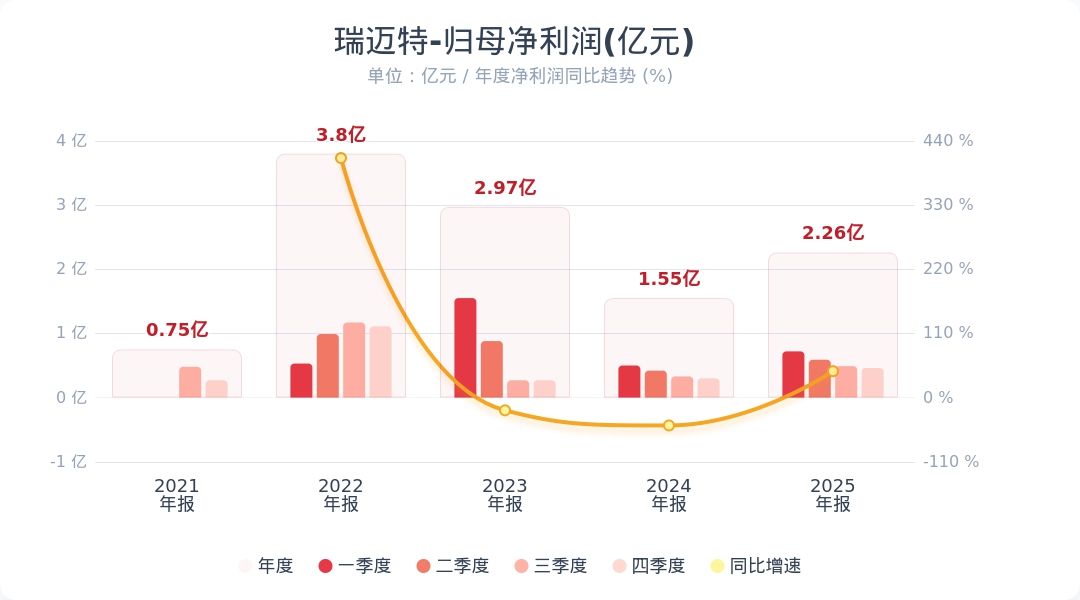 财联社4月22日电,瑞迈特(301367.SZ)公告称,公司发布2025年年度报告摘要,实现营业收入11.59亿元,同比增长37.46%;归属于上市公司股东的净利润为2.26亿元,同比增长45.23%。公司拟向全体股东每10股派发现金红利6.6元(含税),送红股0股,以资本公积金向全体股东每10股转增4股。小财注:公司Q4净利润0.46亿,Q3净利润0.49亿,据此计算,Q4净利润环比下降6%。第四季度净利润分析师一致预测是0.69亿,经计算Q4净利为0.46亿,业绩低于预期。