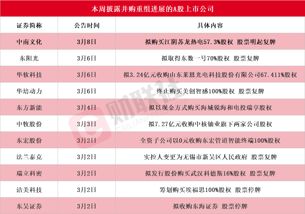 财联社3月8日电,据财联社不完全统计,截至发稿,本周(3月2日-3月8日)包括中南文化、东阳光、华软科技、华培动力、东方新能、中牧股份、东宏股份、法兰泰克、瑞立科密、洁美科技、东吴证券在内的11家A股上市公司披露并购重组进展最新公告。其中,中南文化公告,拟购买江阴苏龙热电57.3%股权,股票3月9日开市起复牌。