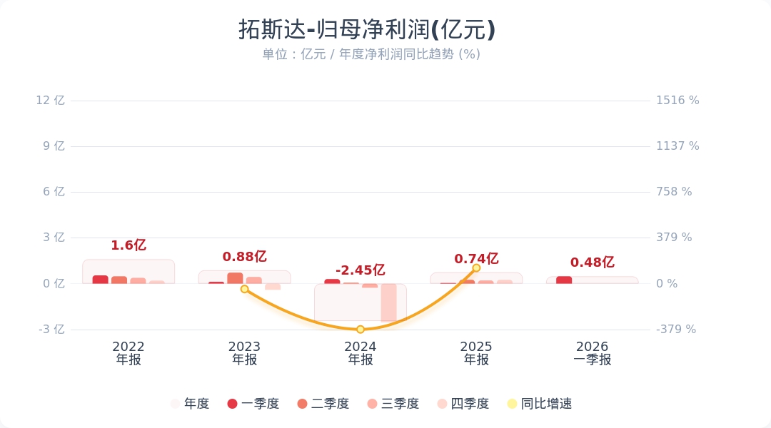 财联社4月22日电,拓斯达(300607.SZ)公告称,2026年第一季度实现营业收入5.38亿元,同比增长48.53%;归属于上市公司股东的净利润为4808.33万元,同比增长1147.36%。业绩变动主要系工业机器人及自动化应用系统业务收入同比增长81.20%,数控机床业务收入同比增长62.54%,注塑装备业务收入同比增长12.22%;收入增长带来毛利增长。小财注:公司Q1净利润0.48亿,2025年Q4净利润0.25亿,据此计算,Q1净利润环比增长95%。