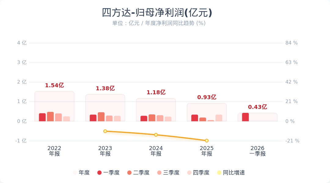 财联社4月22日电,四方达(300179.SZ)公告称,2026年第一季度实现营业收入1.84亿元,同比增长40.20%;归属于上市公司股东的净利润为4292.89万元,同比增长25.66%。业绩变动主要系国内销售增加所致。小财注:公司Q1净利润0.43亿,2025年Q4净利润0.34亿,据此计算,Q1净利润环比增长27%。