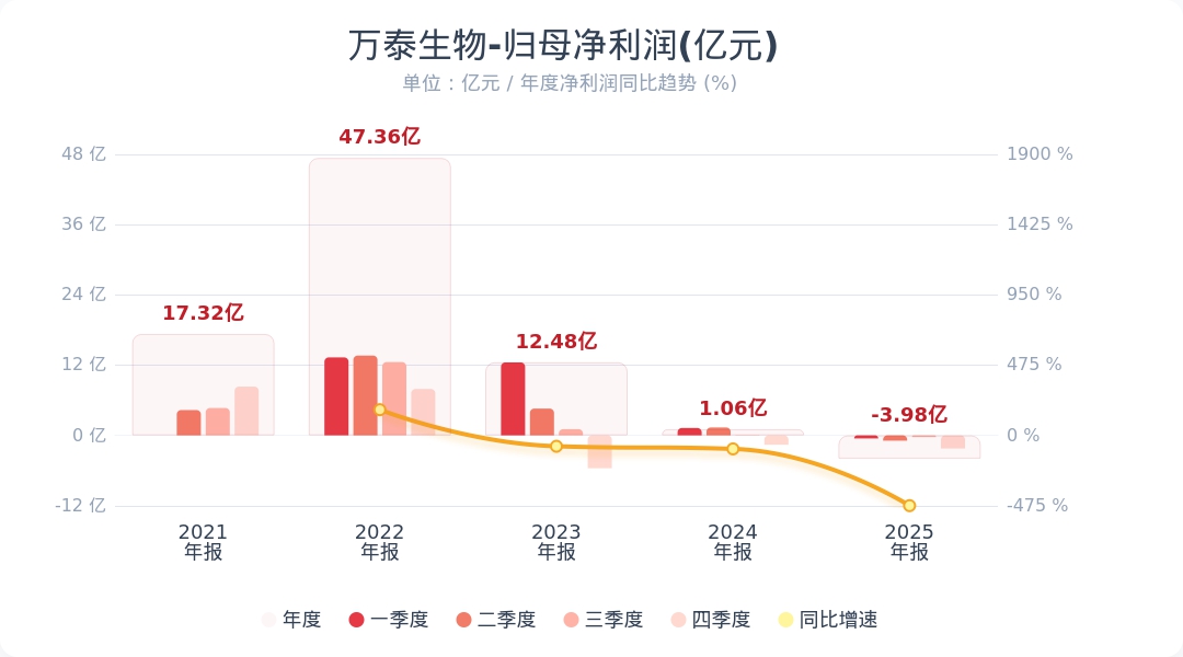 财联社4月20日电,万泰生物(603392.SH)发布2025年年度报告,实现营业收入18.19亿元,同比下降18.99%;归属于上市公司股东的净利润为-3.98亿元,较2024年净利润1.06亿元由盈转亏。公司拟不派发现金红利,不送红股,不以资本公积金转增股本。小财注:公司Q4净利润-2.25亿,Q3净利润-0.29亿,据此计算,Q4净利润持续亏损。第四季度净利润分析师一致预测是5.15亿,经计算Q4净利为-2.25亿,业绩低于预期。