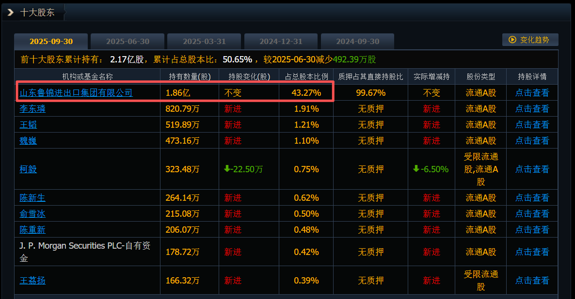 截至2025年三季度末,鲁锦集团持有公司43.27%股份。 公开资料显示,ST新华锦是山东地区一家老牌上市公司,主营发制品和纺织品服装产品的生产加工及出口业务,同时布局了石墨新材料产业和跨境进口电商业务。