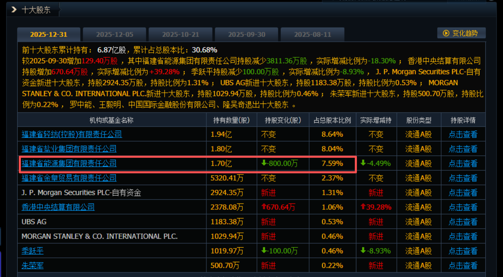 财联社4月20日电,陕西能源(001286.SZ)公告称,公司发布2025年年度报告摘要,实现营业收入229.58亿元,同比下降0.86%;归属于上市公司股东的净利润为30.09亿元,同比增长0.03%。拟向全体股东每10股派发现金红利4.1元(含税),送红股0股,不以公积金转增股本。小财注:公司Q4净利润5.93亿,Q3净利润10.83亿,据此计算,Q4净利润环比下降45%。第四季度净利润分析师一致预测是5.08亿,经计算Q4净利为5.93亿,业绩高于预期。