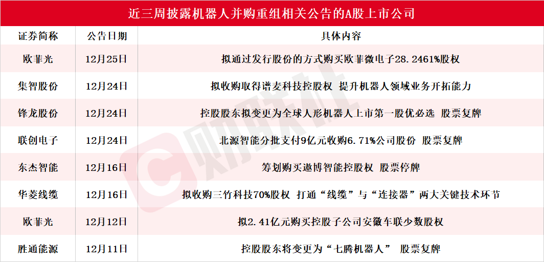财联社12月28日电,据财联社不完全统计,截至发稿,本周(12月22日-12月28日)包括通业科技、百花医药、天创时尚、奥联电子、襄阳轴承、中油资本、华软科技、毅昌科技、威贸电子、百纳千成、嘉亨家化、友邦吊顶、联创电子、锋龙股份、高争民爆、爱尔眼科、集智股份、莱茵生物、ST京蓝、金科环境、宁波港、建龙微纳、星华新材、华联控股、采纳股份、中色股份、领益智造、凌玮科技、旭升集团在内的29家A股上市公司披露并购重组进展最新公告。其中,通业科技公告,拟现金收购思凌科半导体91.69%股权,交易价格5.61亿元。小财注:截至周五收盘,控股股东拟变更为优必选的锋龙股份3连板,拟购买众联世纪100%股份的百纳千成涨停。