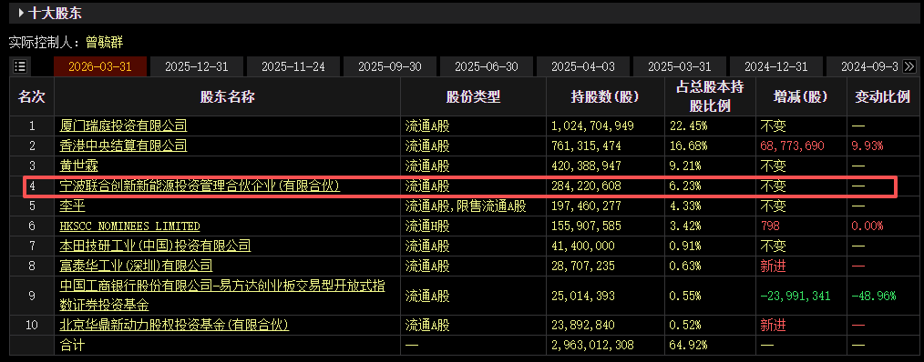财联社4月17日电,宁德时代(300750.SZ)公告称,股东宁波联合创新新能源投资管理合伙企业(有限合伙)拟通过询价转让方式出让5800万股,占总股本的1.27%。小财注:截至一季度末,宁波联合创新新能源投资管理合伙企业(有限合伙)持有宁德时代6.23%股份,为公司的第四大股东。按当日收盘价444.2元/股计算,此次转让股份市值约257.64亿元。