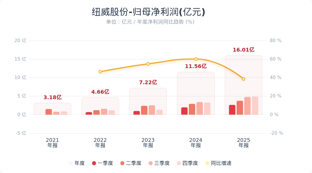 财联社4月17日电,纽威股份(603699.SH)发布2025年年度报告,实现营业收入77.68亿元,同比增长24.53%;归属于上市公司股东的净利润为16.01亿元,同比增长38.54%。公司拟向全体股东每10股派发现金红利10.30元(含税)。小财注:公司Q4净利润4.87亿,Q3净利润4.77亿,据此计算,Q4净利润环比增长2%。