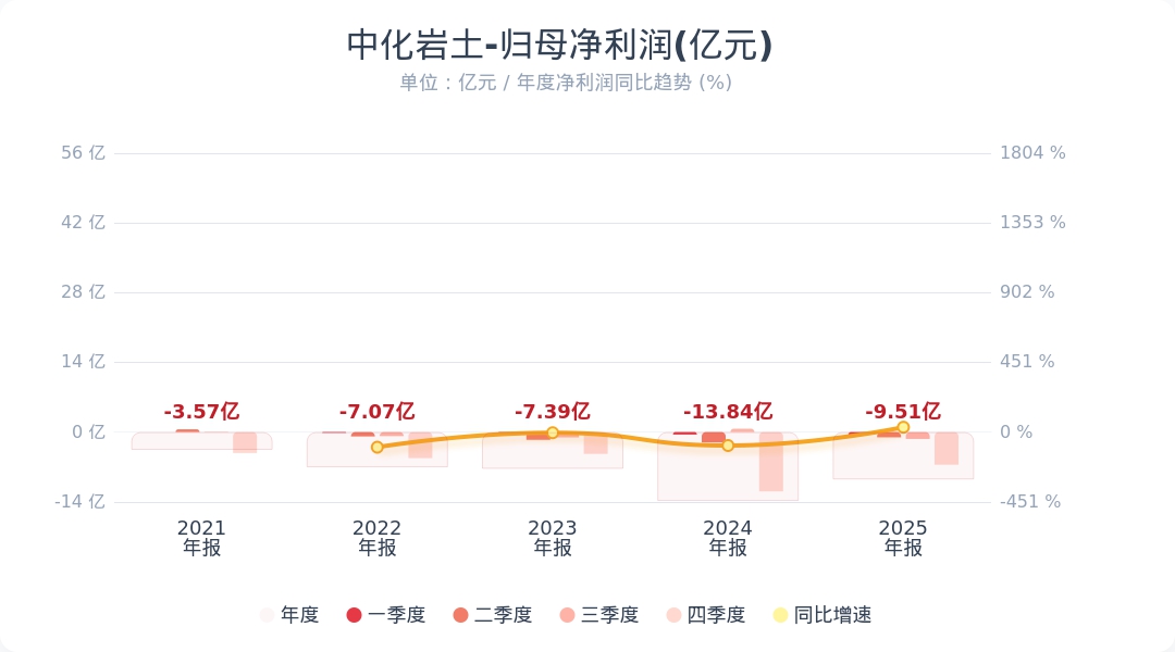 财联社4月17日电,中化岩土(002542.SZ)发布2025年年度报告,实现营业收入10.06亿元,同比下降34.24%;归属于上市公司股东的净利润为-9.51亿元。公司计划不派发现金红利,不送红股,不以公积金转增股本。小财注:公司Q4净利润-6.56亿,Q3净利润-1.38亿,据此计算,Q4净利润持续亏损。
