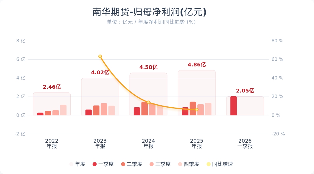 财联社4月20日电,南华期货(603093.SH)公告称,2026年第一季度实现营业收入4.33亿元,同比增长60.66%;归属于上市公司股东的净利润为2.05亿元,同比增长138.82%。业绩变动主要系期货市场投资活跃,客户权益增加,公司客户交易规模增长,使得营业收入增长所致。小财注:公司Q1净利润2.05亿,2025年Q4净利润1.35亿,据此计算,Q1净利润环比增长51%。