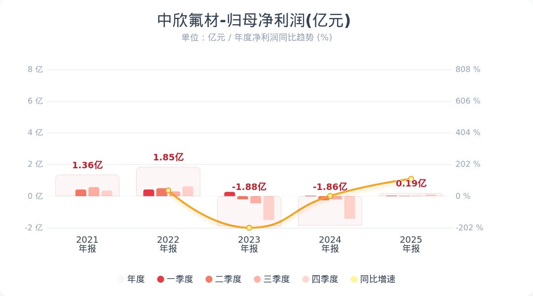 财联社4月20日电,中欣氟材(002915.SZ)发布2025年年度报告,实现营业收入15.71亿元,同比增长11.86%;归属于上市公司股东的净利润为1882.26万元,较2024年净亏损1.86亿元同比扭亏为盈。公司计划不派发现金红利,不送红股,不以公积金转增股本。小财注:公司Q4净利润0.11亿,Q3净利润0.02亿,据此计算,Q4净利润环比增长356%。第四季度净利润分析师一致预测是0.12亿,经计算Q4净利为0.11亿,业绩符合预期。