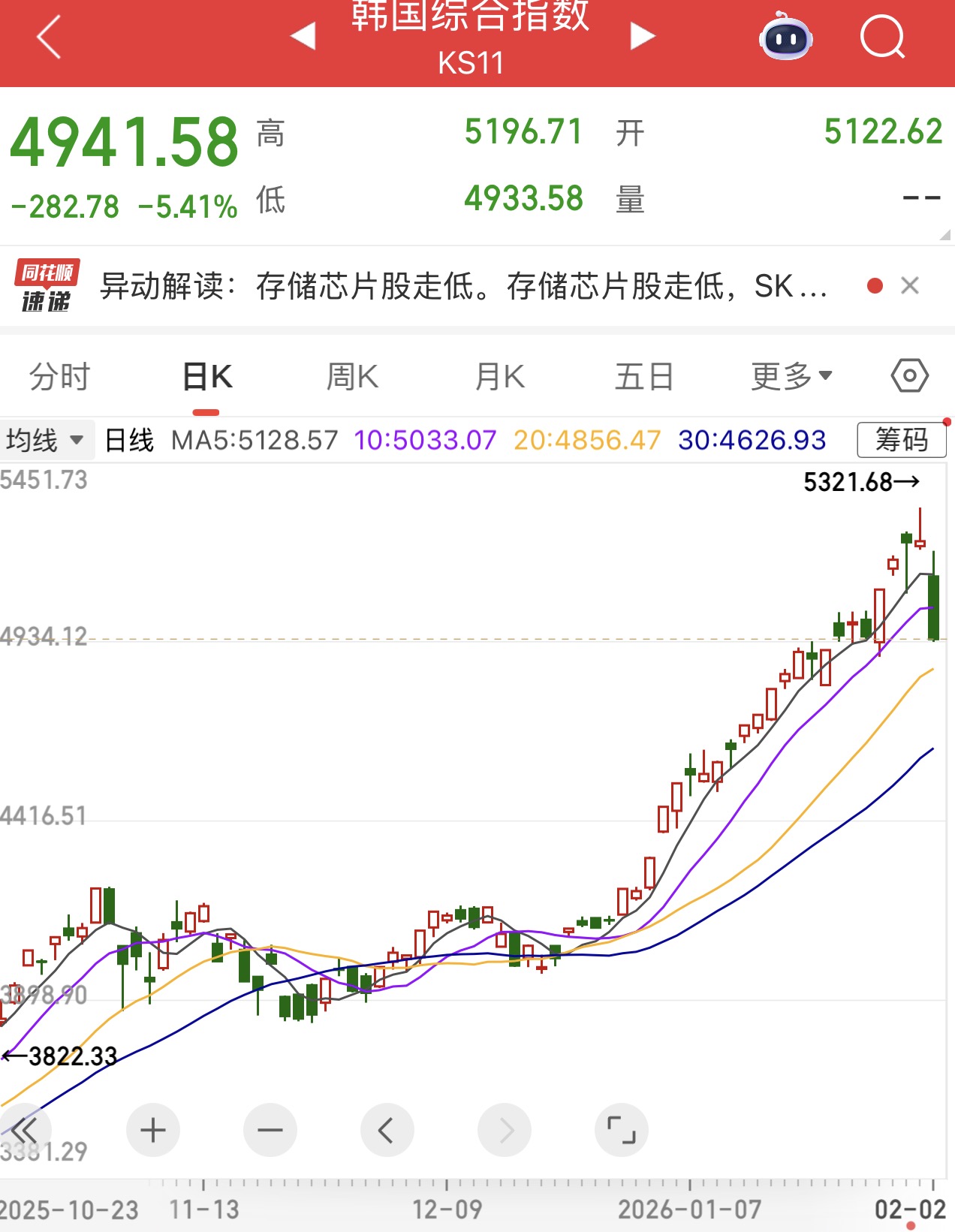 财联社2月2日电,韩国综合股价指数下跌5%至4,962.61点。