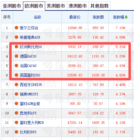 欧洲主要股指集体大涨 德国DAX30指数涨超5%