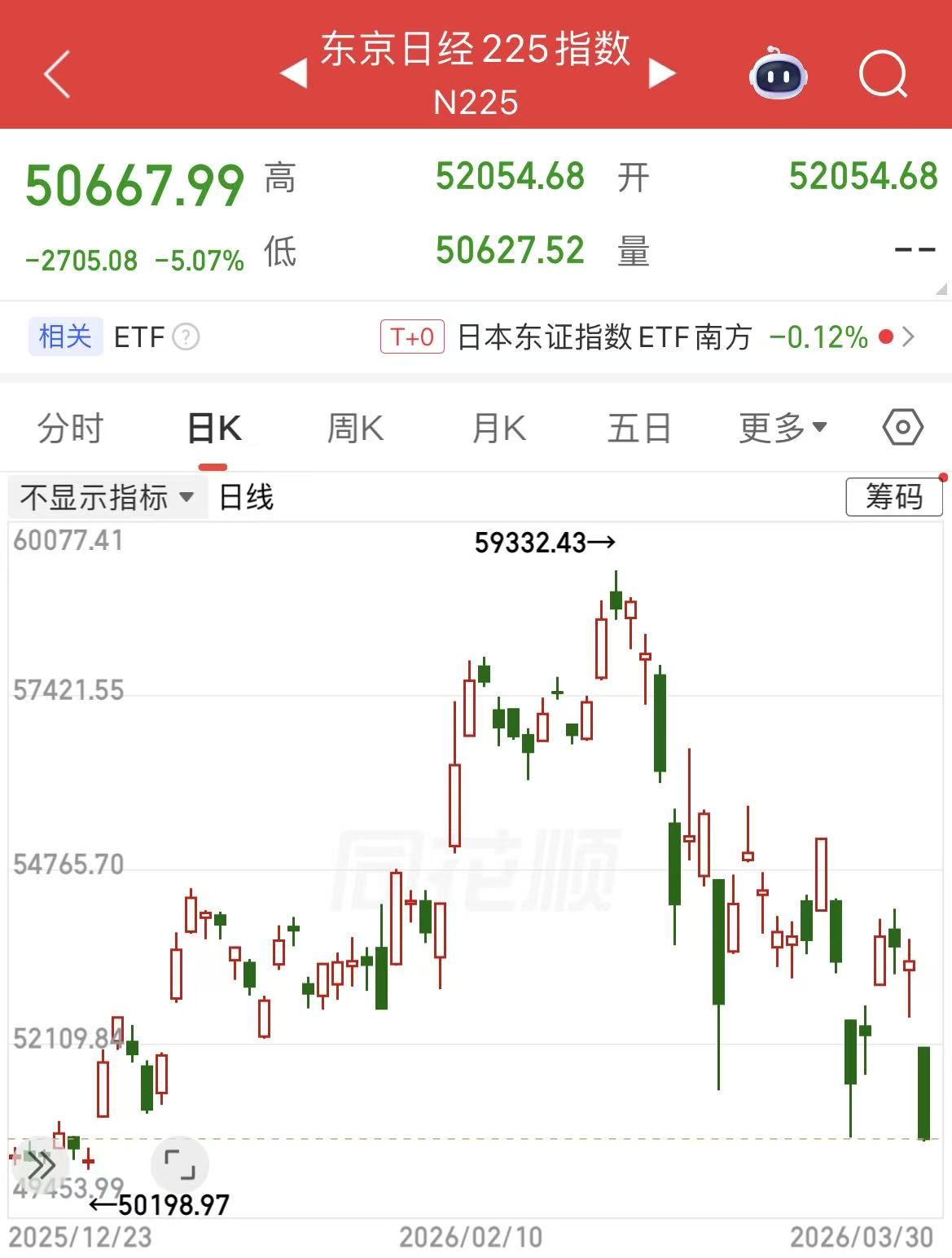 财联社3月30日电,日经225指数跌幅扩大至5%,现报50695.72点。中东战争升级推动油价飙涨,也门胡塞武装周末也加入战局,并且更多美军士兵抵达中东地区。