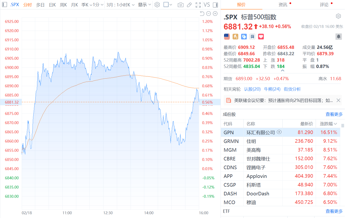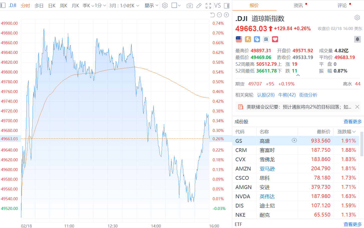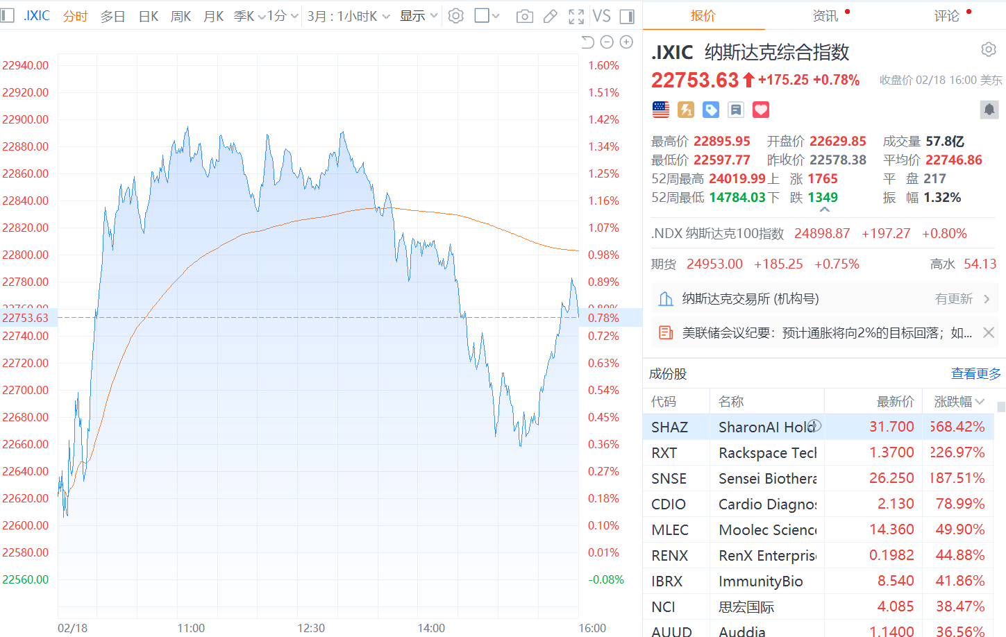 财联社2月19日电,美股三大指数集体收涨,纳指涨0.78%,标普500指数涨0.56%,道指涨0.26%。大型科技股普涨,英伟达、奈飞、亚马逊涨超1%,苹果、特斯拉、谷歌、Meta小幅上涨。美股黄金概念股集体上涨,泛美白银涨超3%,哈莫尼黄金、金田涨超1%。