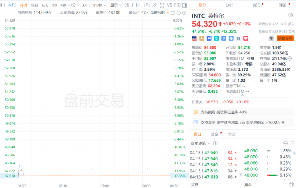 财联社1月23日电,英特尔美股盘前跌超12%。消息面上,英特尔披露业绩,公司预计第一季度营收中值低于市场预期的125.1亿美元,预计第一季度每股盈亏相抵。