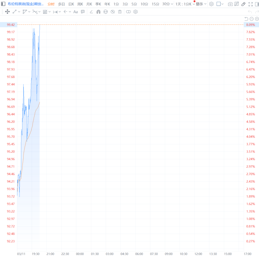 16、国际油价上涨,WTI 4月原油期货收报87.25美元/桶,涨幅为4.55%;布伦特5月原油期货收报91.98美元/桶,涨幅为4.76%。