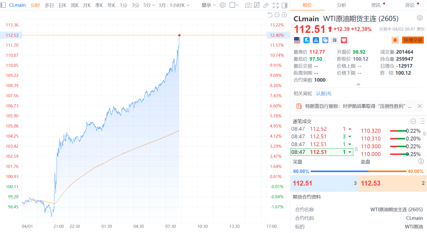 财联社4月2日电,美国西德克萨斯中质油(WTI)期货触及3月9日以来新高每桶108.03美元,盘中大涨8%,此前美国总统特朗普的演说并未提及重启霍尔木兹海峡的细节。