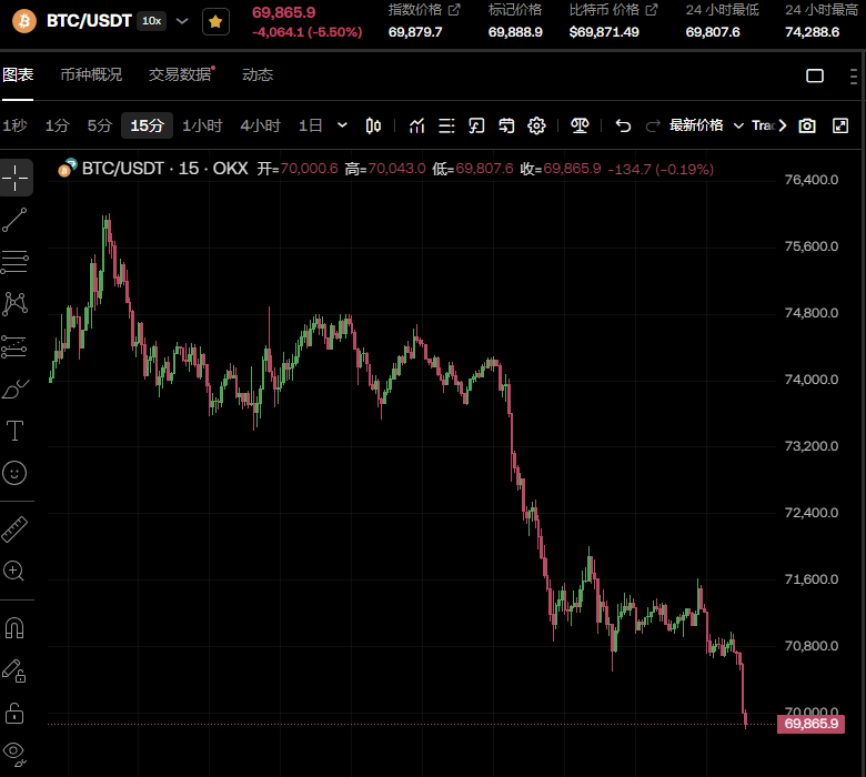 比特币跌破7万美元关口 过去24小时内跌5.4%