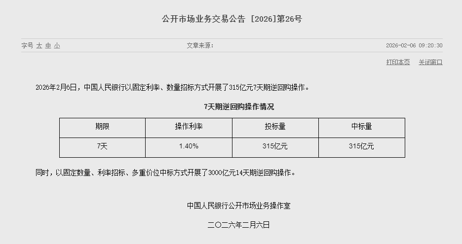 财联社2月6日电,央行今日开展315亿元7天逆回购操作,操作利率为1.40%。同时,以固定数量、利率招标、多重价位中标方式开展了3000亿元14天期逆回购操作。因今日有4775亿元7天期逆回购到期,实现净回笼1460亿元。