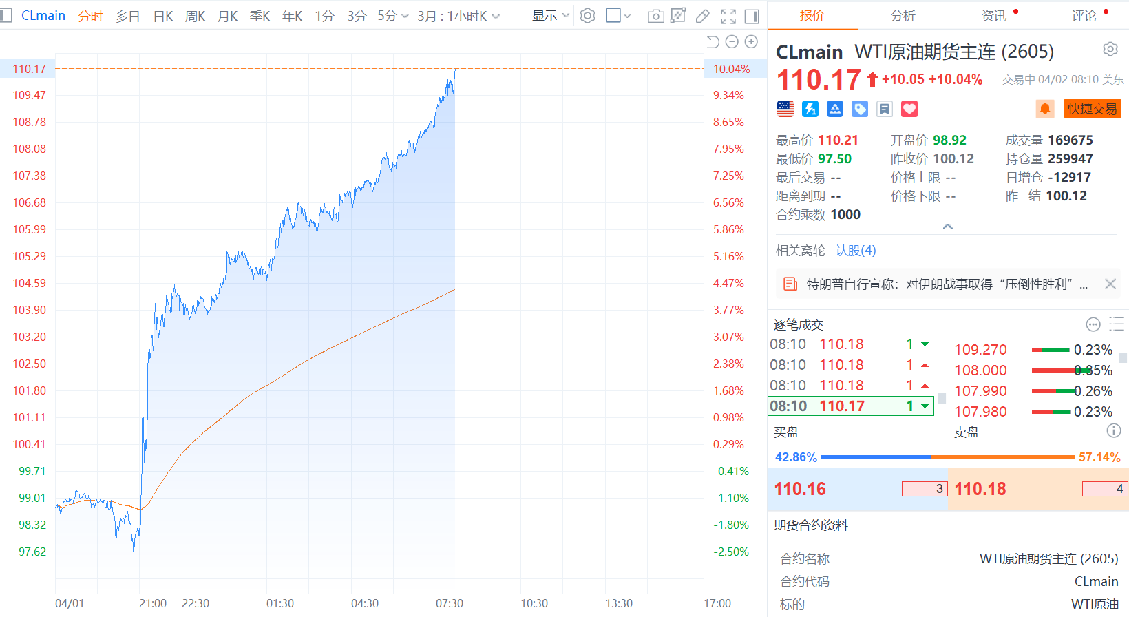 财联社4月2日电,WTI原油期货价格涨10%,报110.077美元/桶;布伦特原油期货价格涨8.06%,报109.318美元/桶。此前美国总统特朗普的演说并未提及重启霍尔木兹海峡的细节,称美军将在未来两到三周内对伊朗进行极其猛烈的打击。消息人士周四表示,由于乌克兰对港口基础设施、管道和炼油厂的打击削弱了出口能力约100万桶/日(约占总能力的五分之一),俄罗斯石油减产已迫在眉睫。