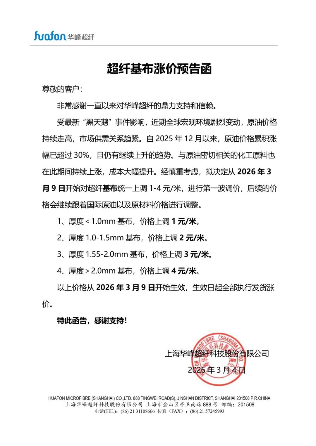 财联社10月20日电,华峰超纤发布涨价预告函称,受最新“黑天鹅”事件影响,近期全球宏观环境剧烈变动,原油价格持续走高,市场供需关系趋紧。自2025年12月以来,原油价格累积涨幅已超过30%,且仍有继续上升的趋势。与原油密切相关的化工原料也在此期间持续上涨,成本大幅提升。经慎重考虑,拟决定从2026年3月9日开始对超纤基布统一上调1-4元/米,进行第一波调价,后续的价格会继续跟着国际原油以及原材料价格进行调整。