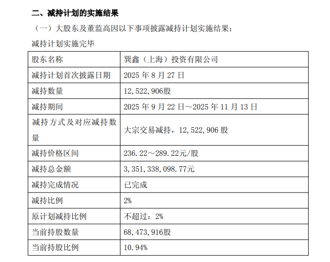 《科创板日报》14日讯,中微公司(688012.SH)公告称,近日,公司收到巽鑫投资出具的《关于股份减持情况的告知函》,巽鑫投资通过大宗交易已累计减持1252.29万股,减持股份数量已达到公司股份总数的2%,本次减持计划已实施完毕。减持期间9月22日~11月13日,减持价格区间236.22~289.22元/股,减持总金额33.51亿元。此次权益变动后,巽鑫投资持有中微公司股份6847.39万股,占公司总股本的10.94%。