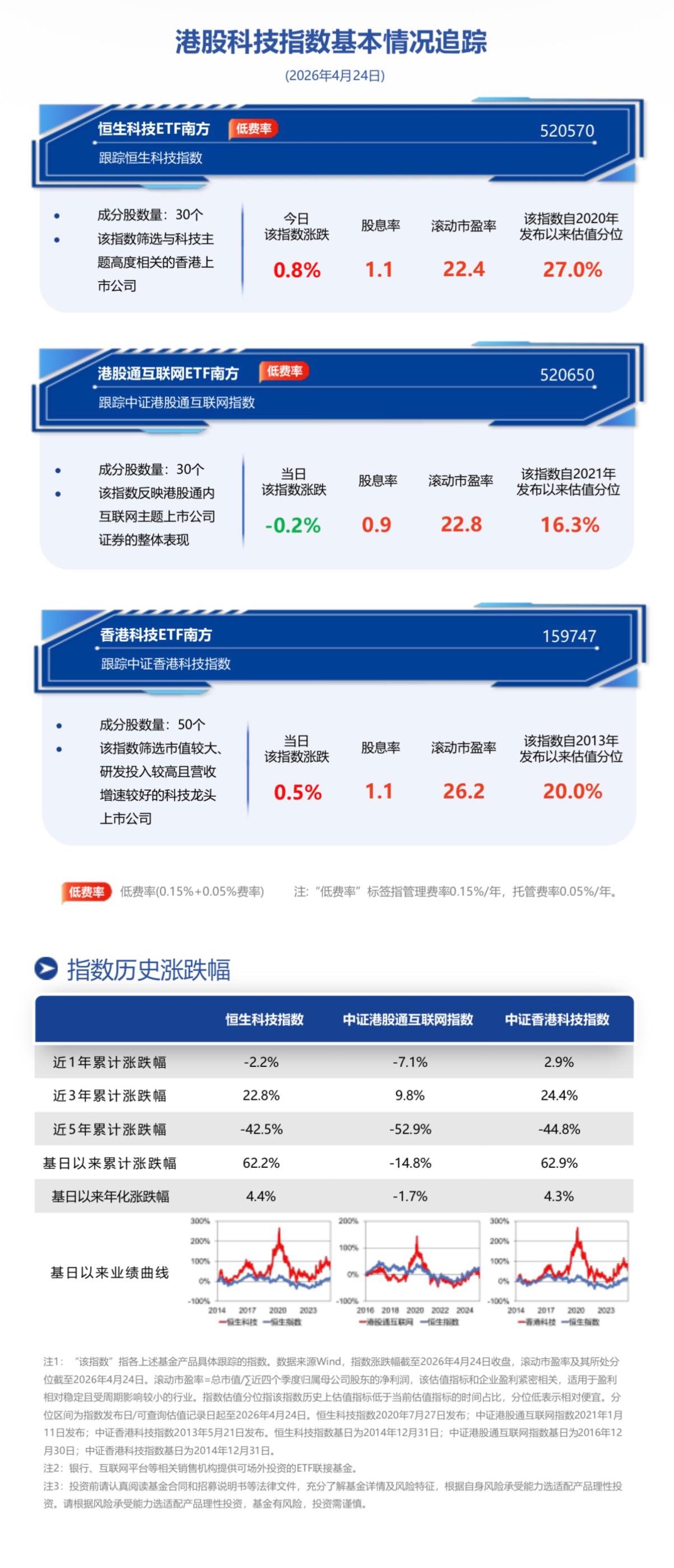今日港股科技板块分化调整,恒生科技指数逆势收涨,今日港股科技板块呈现分化走势,恒生科技指数收报4902.48点,上涨0.76%;港股通互联网指数收报852.67点,下跌0.21%;香港科技指数收报1629.2点,上涨0.49%。 当前港股科技正处估值低位、利空出尽、资金回流、AI催化的四重共振窗口,配置价值突出。恒生科技指数对比全球科技板块性价比显著,业绩下修、解禁等压力已充分释放,基本面环比回暖趋势明确,对长期投资者或可左侧进入,分批建仓。相关产品:恒生科技ETF南方(520570),场外联接基金:A类:020988;C类:020989。港股通互联网ETF南方(520650),场外联接基金:A类:026554;C类:026555。香港科技ETF南方(159747)。
