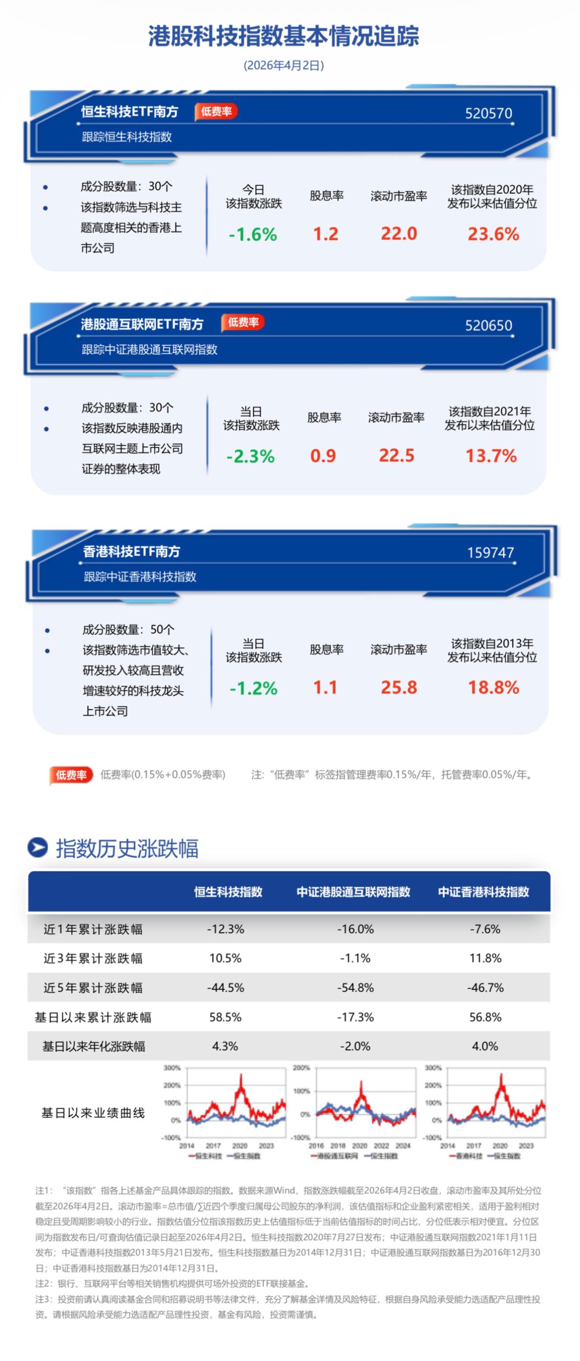 截至4月2日收盘,恒生科技指数报4630.65点,下跌1.63%。恒生科技ETF南方(520570.SH)跟随指数同步下跌,报0.755元,成交额1.1亿元。