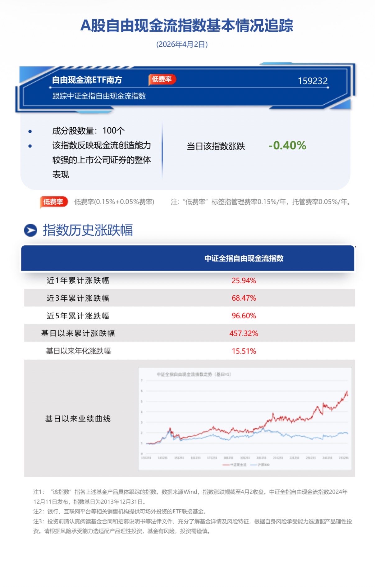 截至2026年4月2日收盘,自由现金流ETF南方(159232)换手5.55%,成交2.27亿元,跟踪标的指数中证全指自由现金流指数(932365.CSI)微跌0.40%。