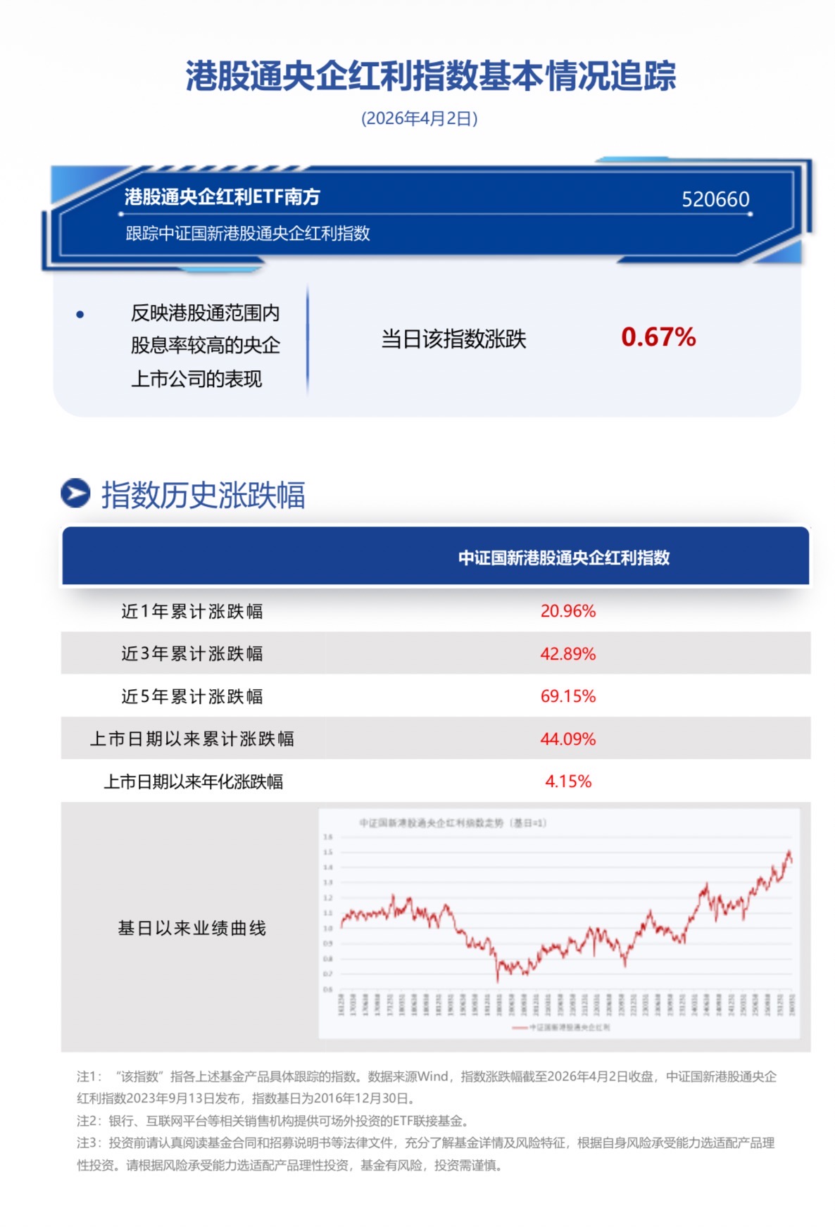 截至2026年4月2日收盘,港股通央企红利ETF南方(520660)换手3.72%,成交2.86亿元,跟踪指数港股通央企红利(931722)涨0.67%。