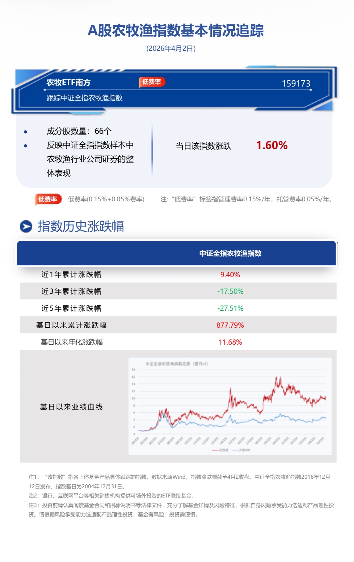 4月2日,农牧ETF南方(159173.SZ)正式上市,该基金紧密跟踪中证全指农牧渔指数(930910),是全市场17只ETF跟踪共7大农业标的指数中唯一一只行业指数,精准覆盖养殖、种植、饲料、动保等核心赛道。