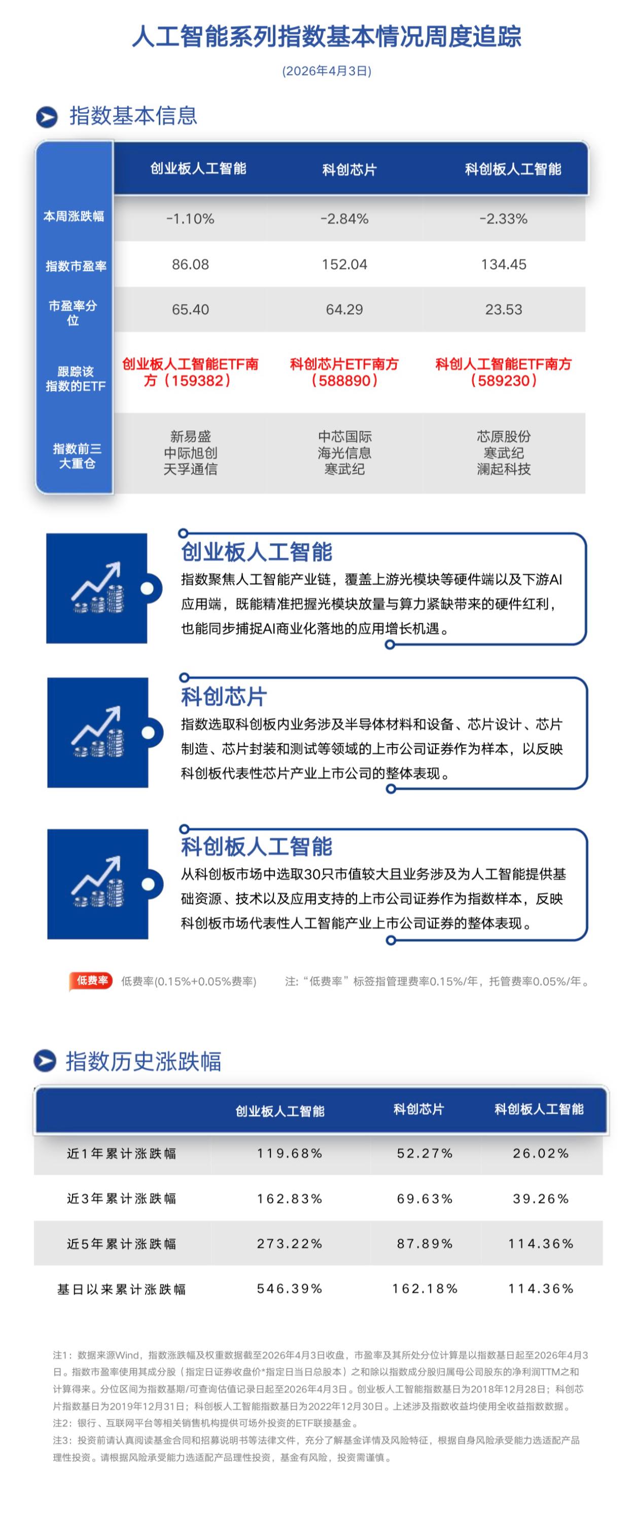 截至周五收盘,创业板人工智能ETF南方(159382) 跟踪标的创业板人工智能本周跌1.10%;科创芯片ETF南方(588890)跟踪标的科创芯片本周跌2.84%;科创人工智能ETF南方(589230) 跟踪标的科创板人工智能本周跌2.33%。