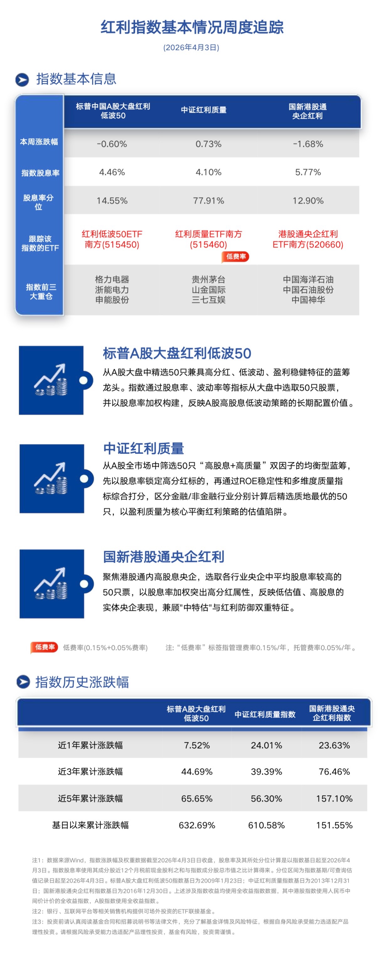 截至周五收盘,红利低波50ETF南方(515450) 跟踪标的标普中国A股大盘红利低波50本周跌0.60%;红利质量 ETF南方(515460)跟踪标的中证红利质量本周逆势收涨0.73%;港股通央企红利ETF南方(520660) 跟踪标的国新港股通央企红利本周跌1.14%。