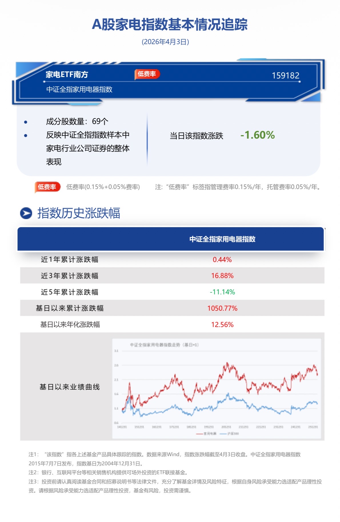 南方基金旗下家电ETF南方(159182)于4月8日启动发售,截至昨日收盘,该ETF跟踪指数中证全指家用电器指数近三年年化收益6.15%。